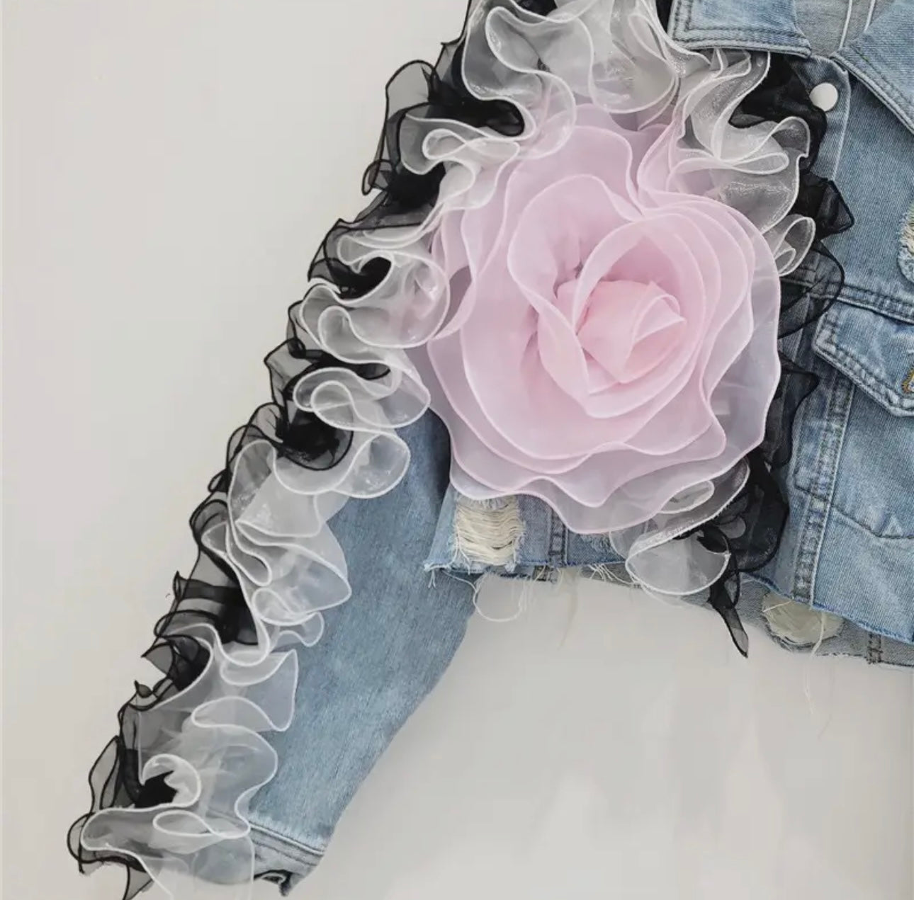 Turn everyday denim into a runway moment. This distressed denim jacket is reimagined with dramatic layered tulle accents and oversized floral detailing for a bold, feminine edge. Perfectly blending street style with high fashion, it’s the statement piece that takes any outfit from casual to unforgettable. Pair it with sleek bottoms or a simple dress to let the jacket steal the spotlight.