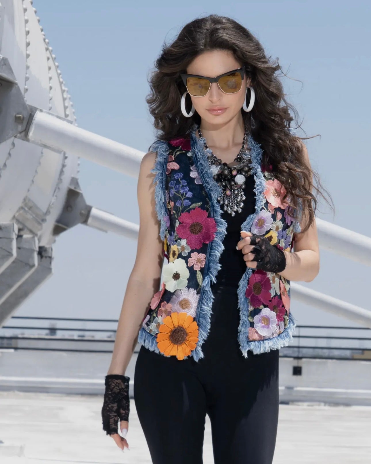 Oversized denim raw-edge fringe vest with embroidered flowers in vibrant hues!