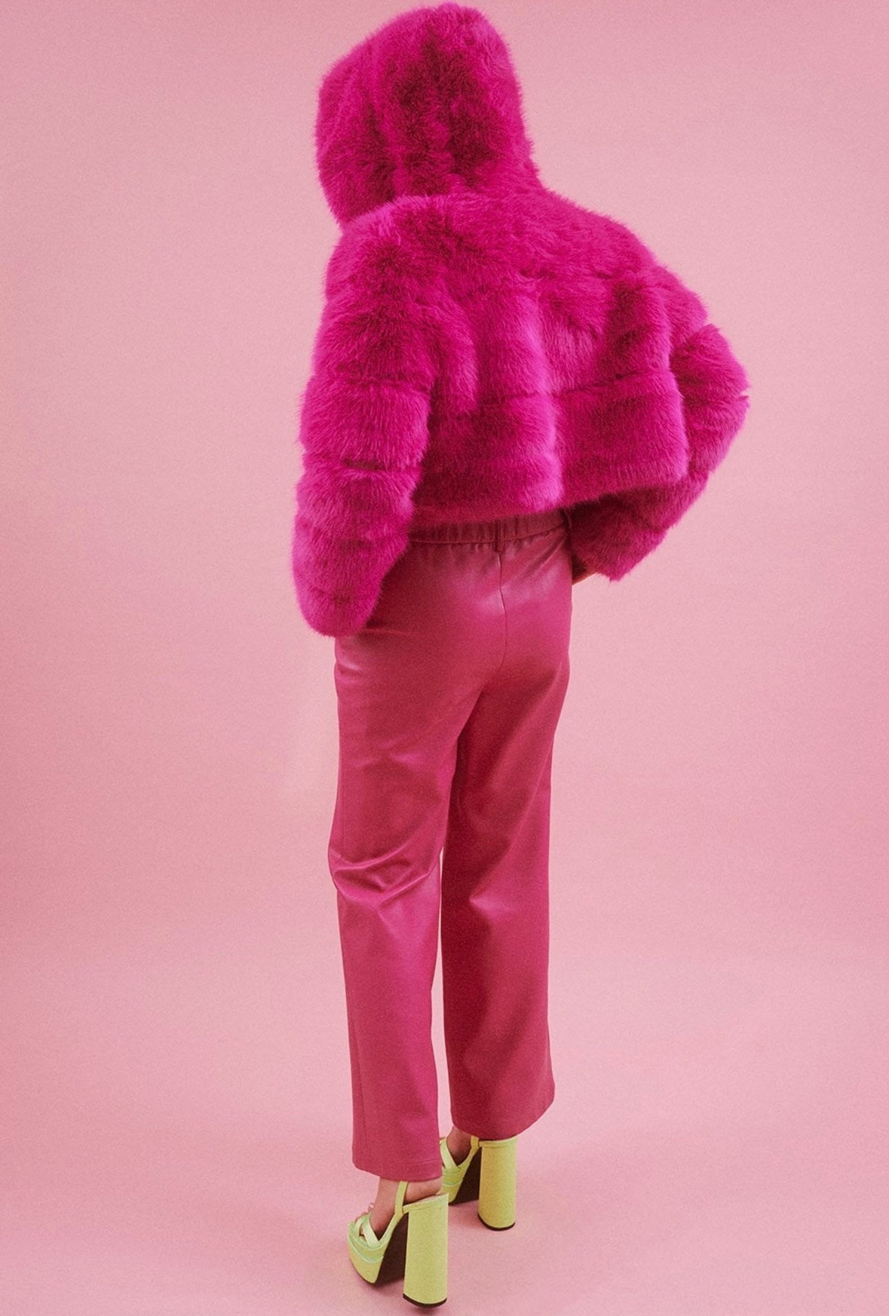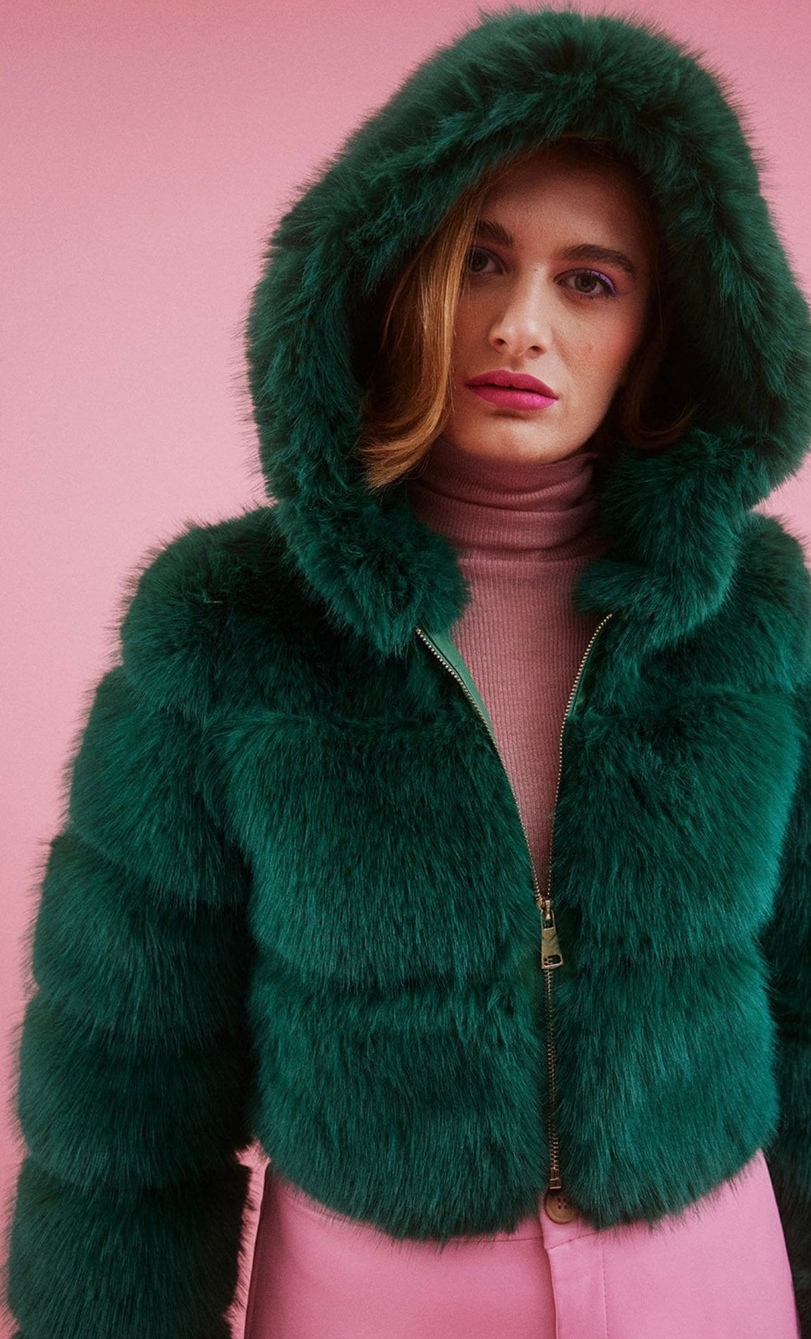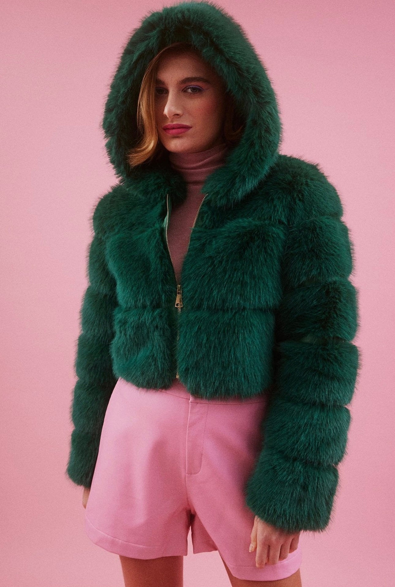 Hooded Bamboo Faux Fur Puffer Jacket (White, Green, Fuschia)