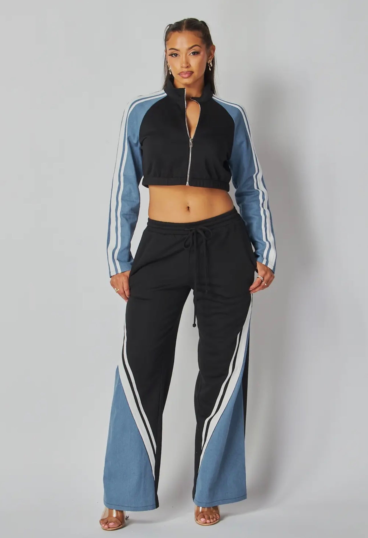 This stylish ensemble features a cropped zip-up jacket and wide-leg pants, combining comfort and flair.  The contrasting colors and sporty stripes add a trendy touch, making it perfect for casual outings or lounging in style.  Elevate your athleisure game with this must-have set!  5% SPANDEX!