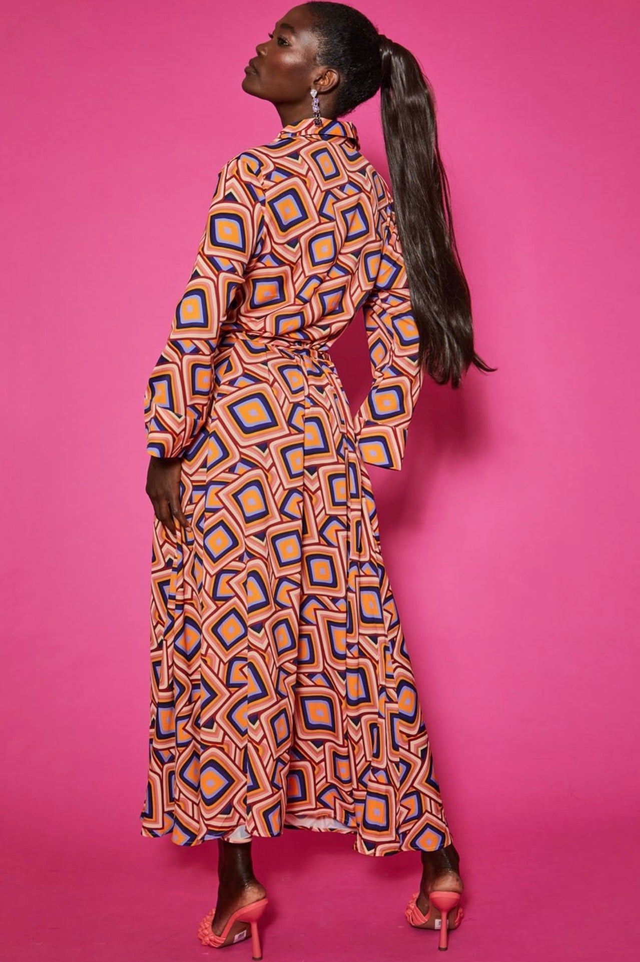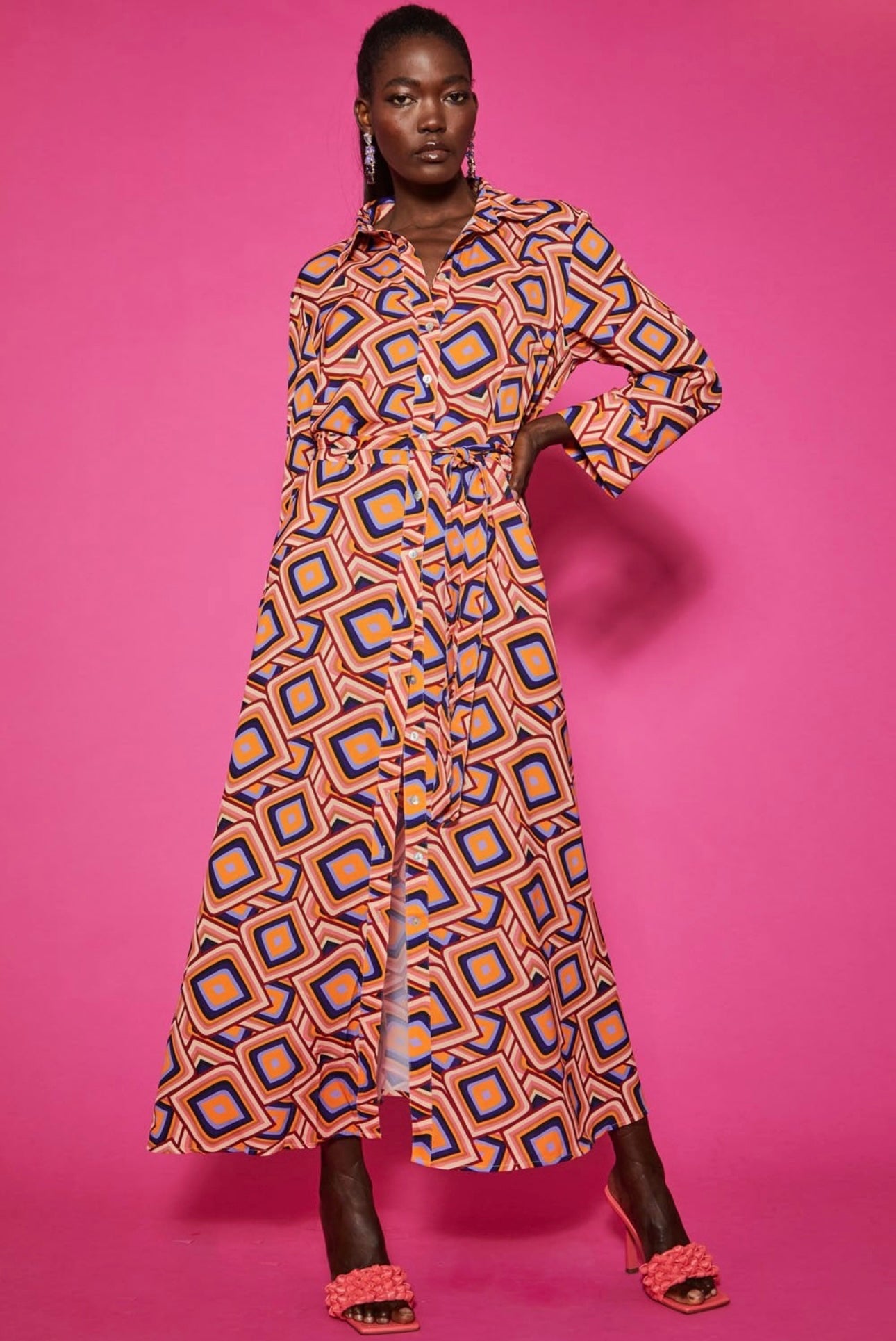 • Load image into Gallery viewer, Silk Blend Geometric Print Maxi Shirt Dress