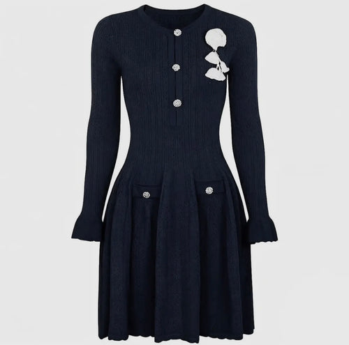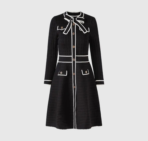 VIENNA CHARM Classic Contrast Trim Knit Dress | Black & White Bow Detail