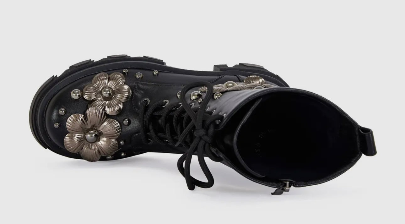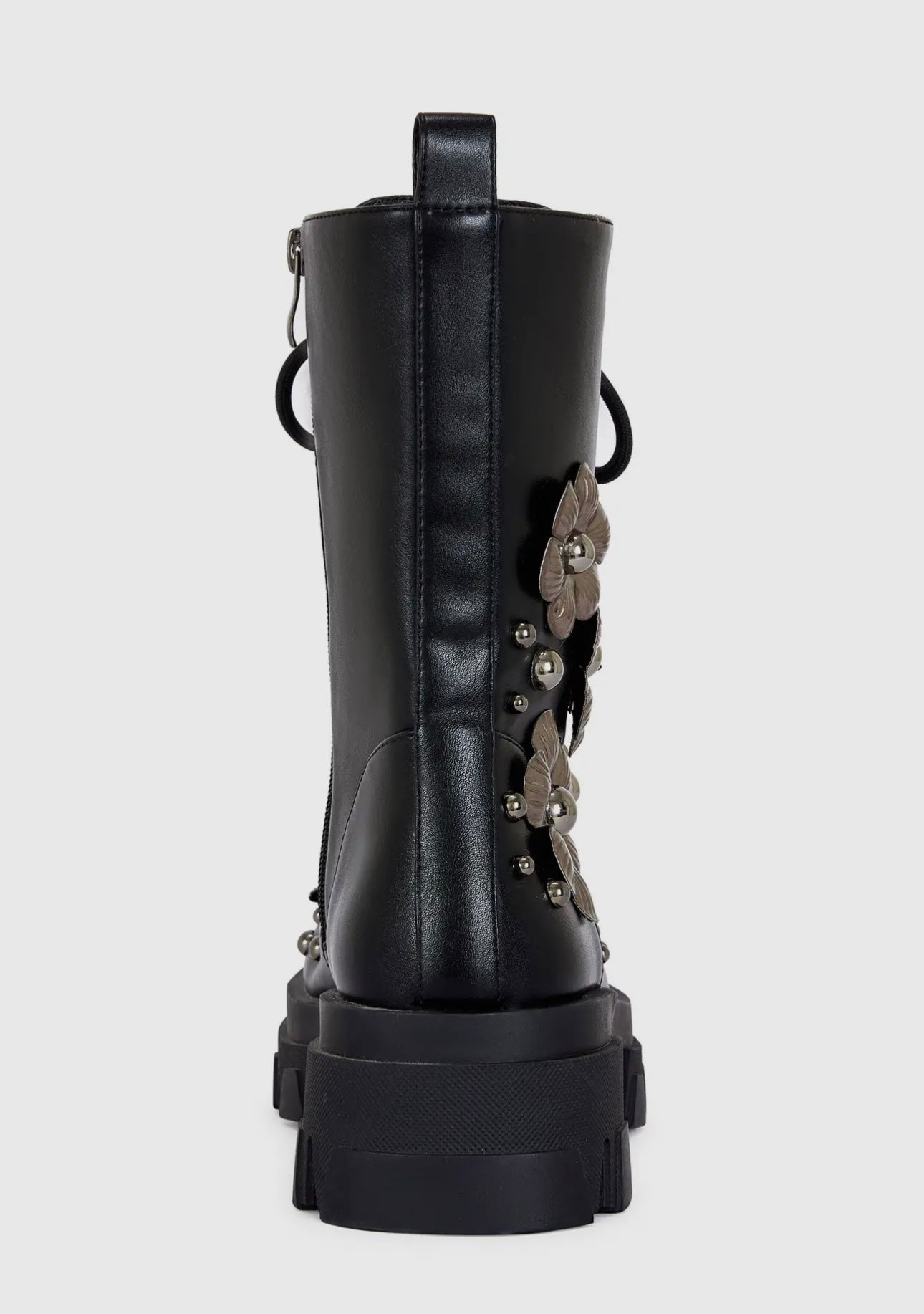 Unleash your inner rebel with our Boho Chunky Boots, featuring laced-up design and stunning embellished silver flowers. Perfect for adding a touch of edgy elegance to any outfit!
