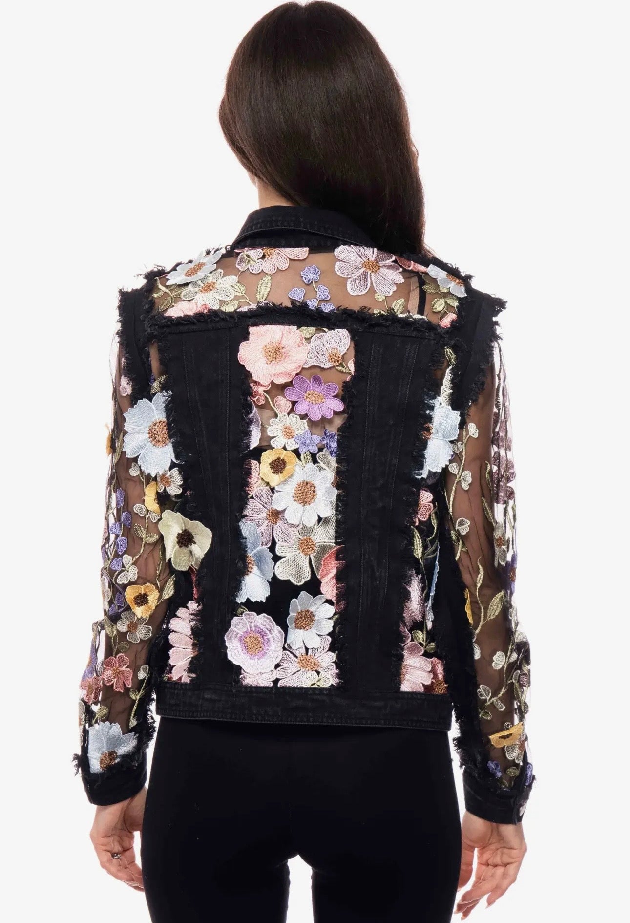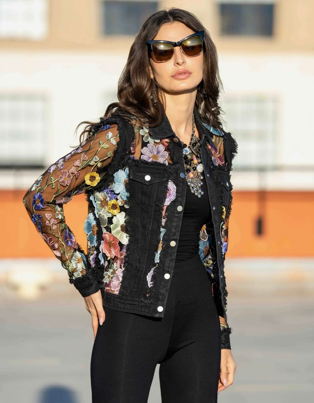This standout jacket features a black denim body accented with sheer mesh sleeves embroidered in vibrant multicolor florals. Designed with classic denim construction and modern sheer detailing, it delivers a bold yet feminine statement. Subtle frayed edges add texture and dimension, giving the piece a fashion-forward finish.
