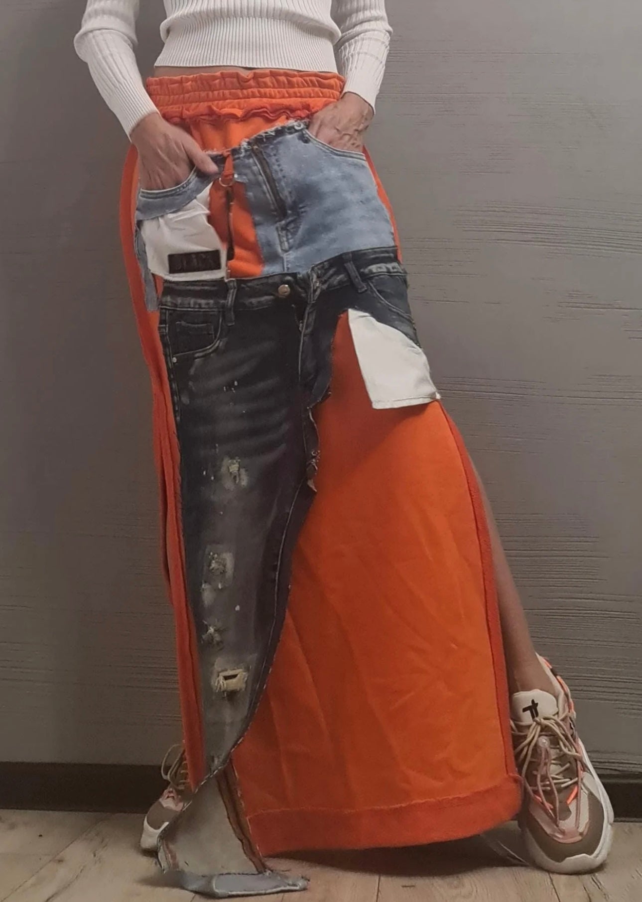 Redefine casual with this masterpiece of deconstruction. This maxi skirt is a collision of textures and tones, fusing the rugged durability of vintage-wash denim with the soft, vibrant flow of jersey fabric.