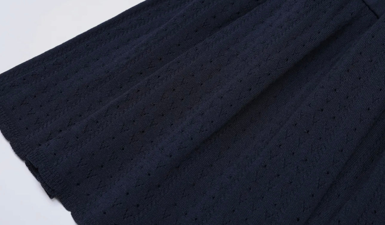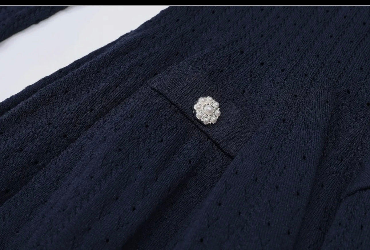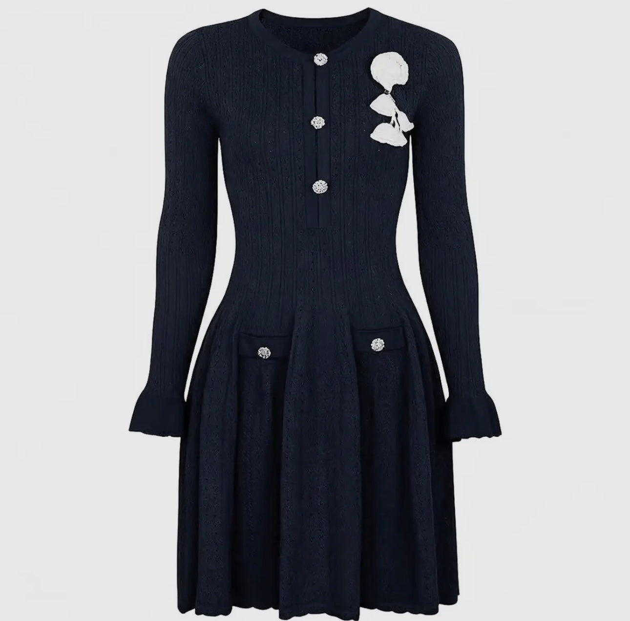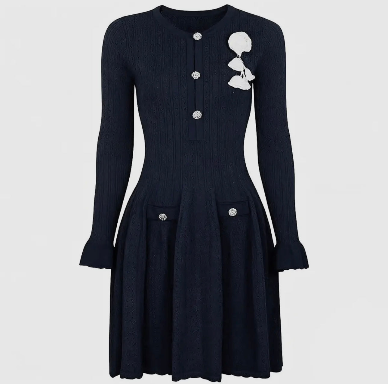 Step into timeless style with the Navy Elegance Knit Dress. A navy fit-and-flare silhouette with crystal buttons and floral detailing — perfect for day or evening wear.